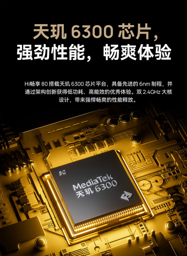 核心配置上,Hi畅享80搭载天玑6300芯片,6nm制程工艺,支持最高8GB内存融合,内置5000mAh电池,号称"超四年耐用大电池",千次充放电循环后,电池健康度维持85%,支持10W充电。