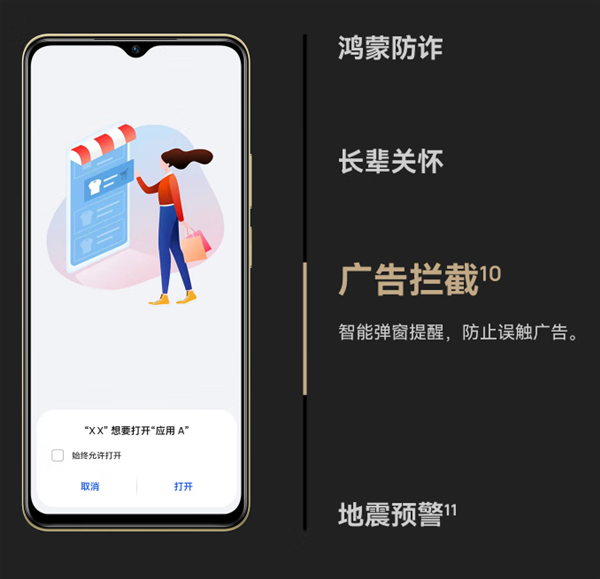 据了解,Hi畅享80获得HarmonyOS Connect认证,是鸿蒙生态手机,具备鸿蒙分布式能力,支持自动拦截和提示诈骗电话、广告拦截、地震预警等鸿蒙安全守护。