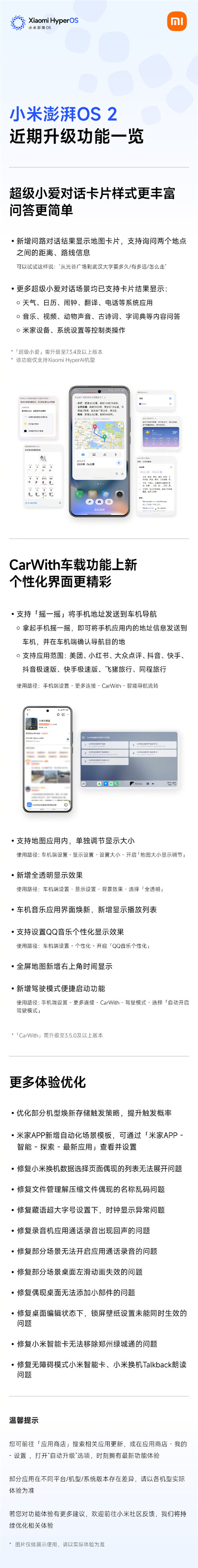 一图了解小米澎湃OS 2近期升级:CarWith界面更新、超级小爱对话卡片上新