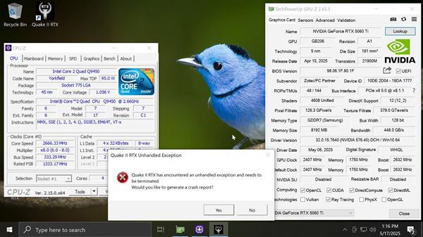 他尝试运行《雷神之锤2RTX(QuakeIIRTX)》时,游戏直接崩溃,这表明尽管RTX 5060 Ti显卡具备强大的图形处理能力,但老古董Core 2处理器的性能瓶颈严重限制了整体体验。