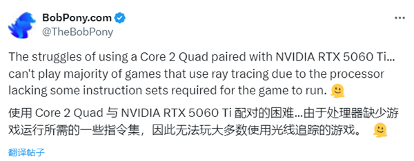 Bob Pony发现,由于Core 2处理器缺乏一些现代游戏所需的指令集,大多数支持光线追踪的游戏都无法正常运行,其实这也并不令人意外,毕竟CPU太老了。