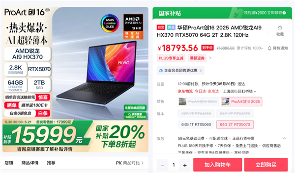 ProArt 创16 2025目前已经开售,首发价17999元,近期正值618活动期,可以领取至高20%国家补贴后到手仅15999元起,更有晒单赠送触控笔,返100E卡,白条6期免息等福利。