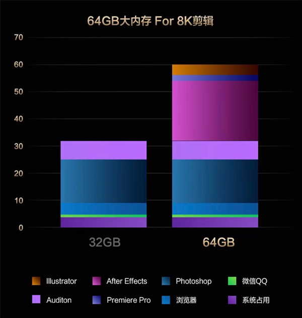 ProArt 创16 2025还搭载了64GB 7500MHz LPDDR5X大内存与至高2TB SSD,满足多任务并行与大型素材存储需求,并且提供了额外的M.2硬盘位,可根据需求进行扩展。日常系统占用、QQ微信、网页浏览、打开两个大于2GB的PS文件、编辑一段8K视频的内存占用就已经超过32GB。创16 2025最高可选64GB大内存,而64GB还可以再额外打开AE进行渲染,AU剪辑音轨,AI制作矢量图,64GB仍有剩余,让您彻底摆脱内存焦虑。