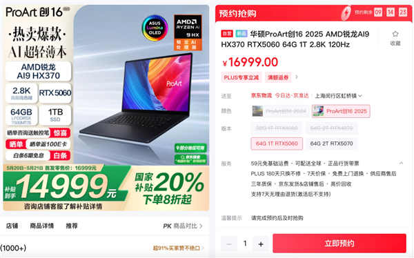 此外,ProArt 创16 2025 RTX 5060版本现已开售,首发16999元,同样可以享6期免息、晒单赠E卡、赠送触控笔等福利,大家可以根据自己的需求选择。