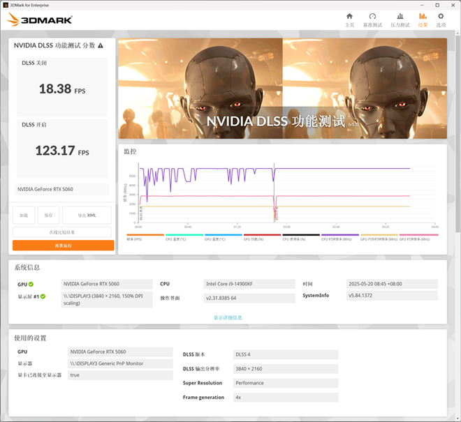 技嘉RTX 5060小雕显卡在3Dmark NVIDIA DLSS功能测试中,可以测试最新的DLSS 4性能,实测关闭DLSS 4时帧数为18.3FPS左右,开启DLSS 4 2x之后帧数上升为73.54FPS,开启DLSS 4 3x之后帧数上升为100.69FPS,开启DLSS 4 4x之后帧数上升为123.17FPS。