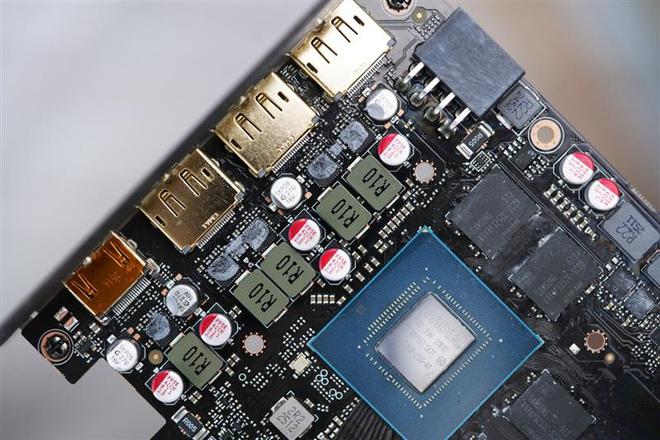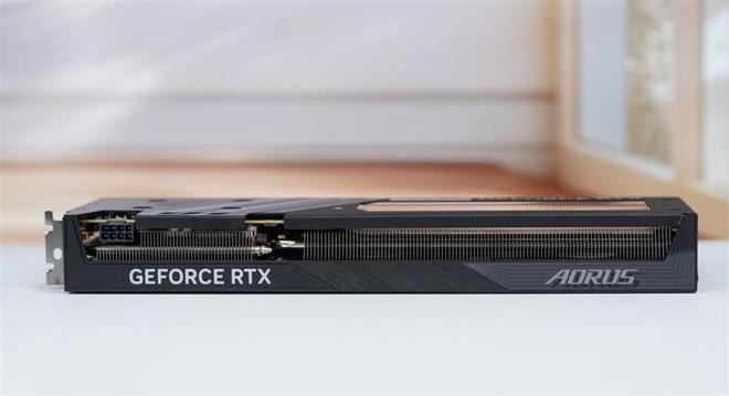 技嘉RTX 5060小雕显卡的顶部,从镂空中可以看到散热鳍片和穿插其中的热管,8P供电接口设计在显卡挡板处非常少见。