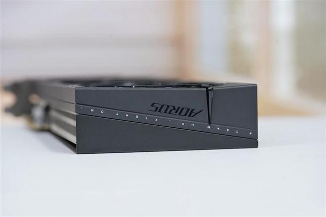 技嘉RTX 5060小雕显卡的金属背板上设计了长度超过显卡一半的超大镂空,尾部两枚风扇都可以直接吹透显卡,背板上印有技嘉AORUS的Logo和倾斜的装饰线条。
