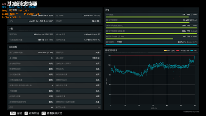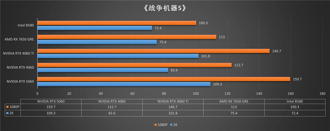 在《战争机器5》中,使用超高画质进行测试,在2K分辨率下帧数为109.3,1080P分辨率下帧数为159.7。