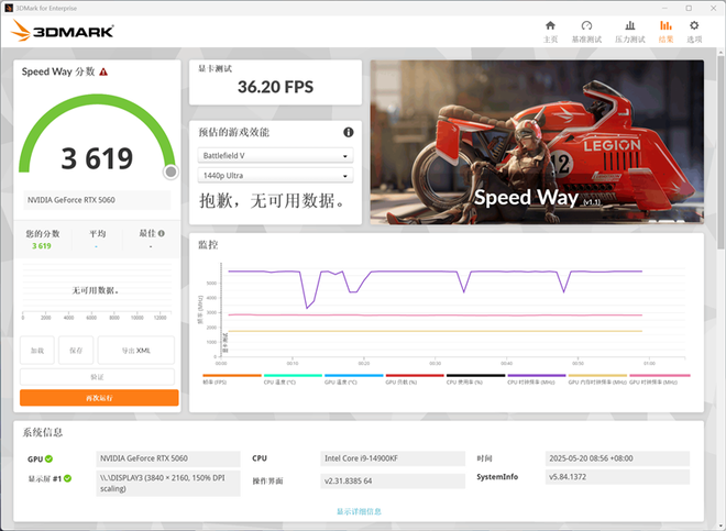 在3DMark测试综合性能的Speed Way测试中,技嘉RTX 5060小雕显卡的总成绩为3619,其中显卡测试成绩为36.2FPS。
