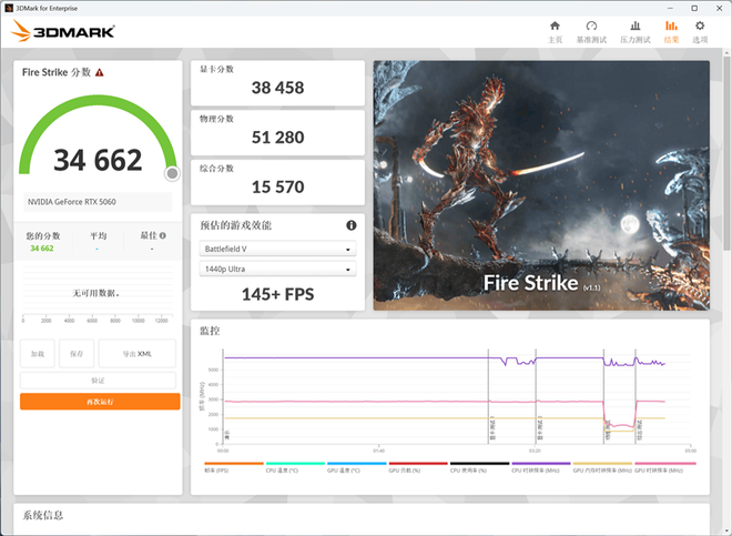 在3DMark的Fire Strike(DX11+1080P渲染分辨率)测试中,技嘉RTX 5060小雕显卡的总成绩为34662,其中显卡分数为38458。