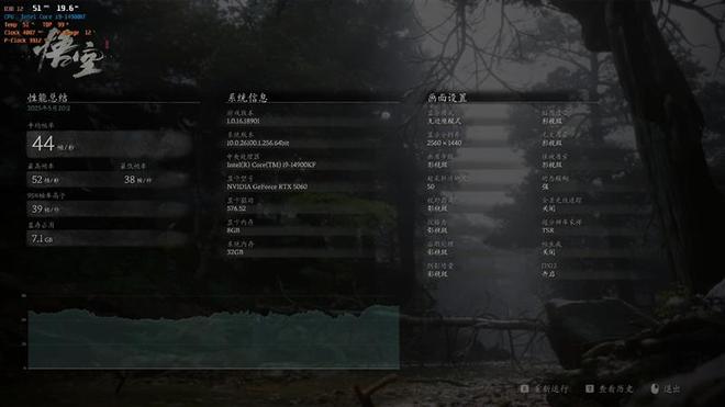 在《黑神话·悟空》中,我们使用影视级画质预设,关闭光追,使用TSR采样,精度设置为50,在2K分辨率下帧数为44,1080P分辨率下帧数为52。