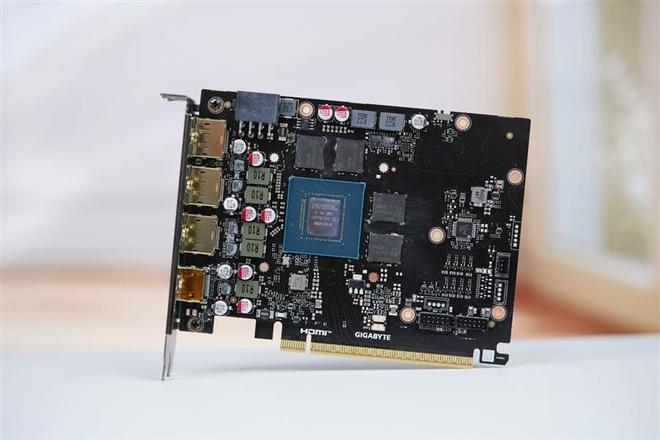 技嘉RTX 5060小雕显卡的PCB全貌,可以看到PCB非常小巧,而且元件密度也不高,核心和显存集中在PCB中部,镀金的显示接口非常豪华。