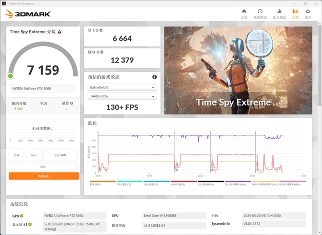 在3DMark的Time Spy Extreme(DX12+4K渲染分辨率)测试中,技嘉RTX 5060小雕显卡的总成绩为7159,其中显卡分数为6664。