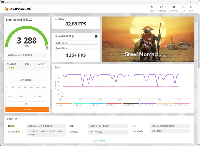 在3Dmark中测试可靠性、稳定性和持续性能的Steel Nomad测试中,技嘉RTX 5060小雕显卡的总成绩为3288,其中显卡测试成绩为32.88PS。