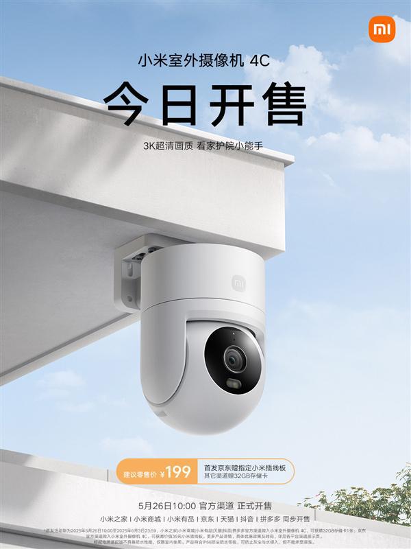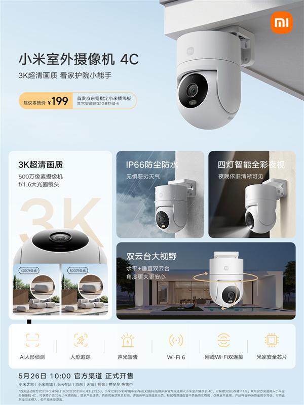 5月26日消息,小米室外摄像机4C今天正式开售,首发价199元。