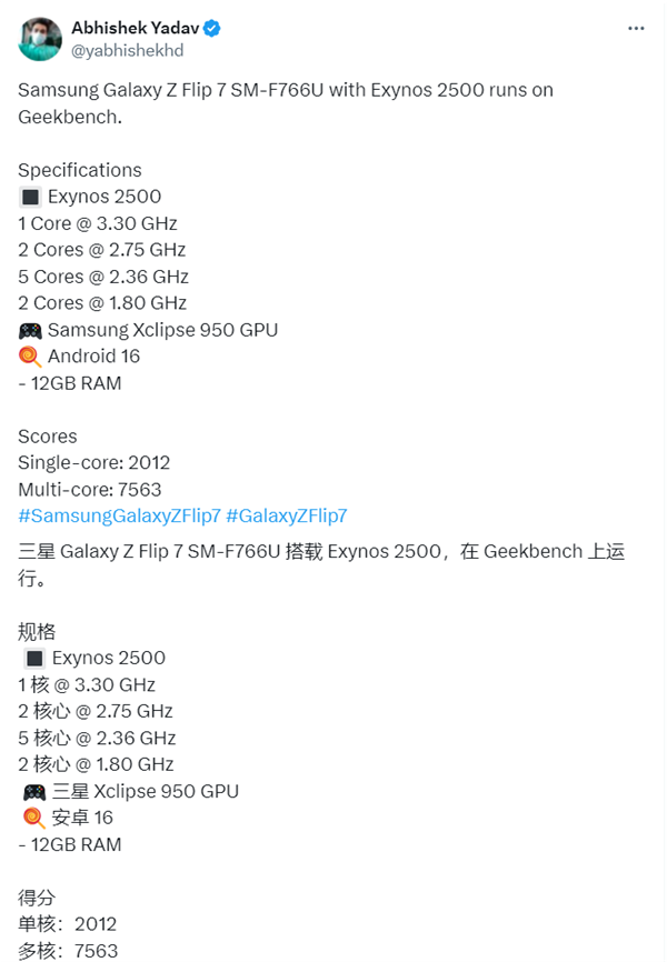 根据之前的爆料,三星Galaxy Z Flip 7可能会首发搭载Exynos 2500,而Galaxy Z Fold 7则会搭载性能更强的骁龙8至尊版。