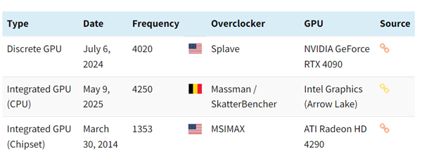 根据Massman的博客Skatter Bencher的说法,这一成就创造了集核显频率和整体GPU频率的新世界纪录。