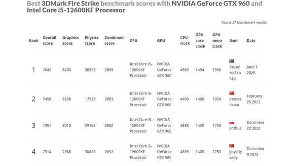 这种改装后的组合在3DMark Fire Strike测试中打破了GTX 960和英特尔酷睿i5-12600KF处理器的最高纪录,得分为7642,超过了之前的7458。