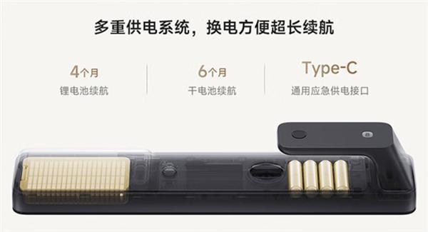 续航上,门锁采用4节碱性干电池+5000mAh锂电池组合供电,组合最长续航可大1年时间,支持Type-C应急供电接口。