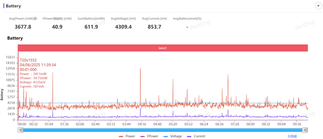游戏的平均功耗为2.067W,帧能耗34.5mW,能效比为28.98FPS/W。