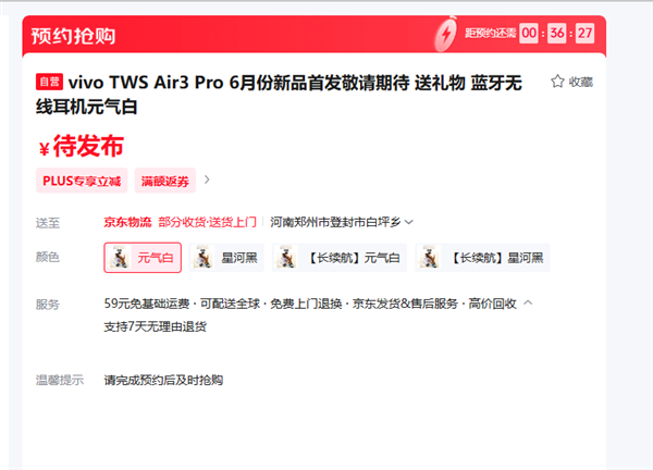 预约页面显示,vivo TWS Air3 Pro提供标准版和长续航两种版本,可选元气白、星河黑配色。