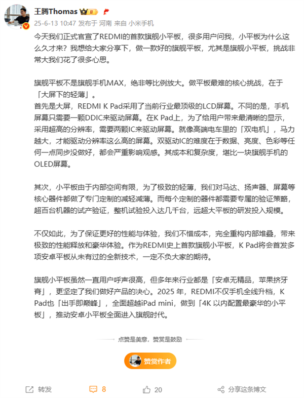 为了极致轻薄,REDMI对马达、扬声器、屏幕等核心器件做了专门定制减轻减薄,远超大平板的研发投入规模。