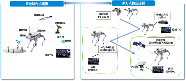 卫星通信机器狗携带移动通信基站,在无信号覆盖区域,通过卫星链路以天地一体方式实现不间断的信号覆盖。