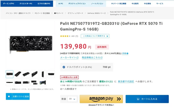 同样,RTX 5070 Ti显卡的价格也出现了下降,Palit GeForce RTX 5070 Ti Gaming Pro-S版在亚马逊上的售价为139,980日元,比官方建议零售价148,800日元低了6%,此次降价是该显卡首次在日本市场跌破官方建议零售价。