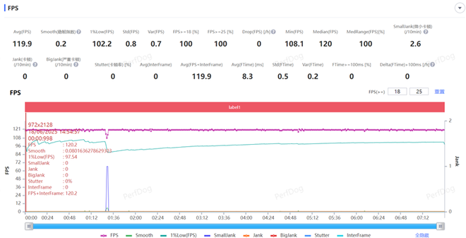 《王者荣耀》手游在开启极致画质+极高帧率下特效拉满,进行一局5V5团战测试,一句对战下来游戏的平均帧率稳在了119.9FPS,游戏的平均波动仅有0.2FPS,1%Low帧达到102.2FPS,可以说整局游戏帧率异常平整,虽然游戏期间了细微的掉帧现象,但不会对游戏画面造成任何卡顿。