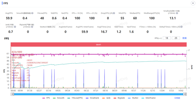 最后我们测试了《原神》手游,在最高画质+60帧模式下,进行一局15分钟的须弥城跑图测试,游戏的平均帧率稳定在了59.9FPS,游戏的平均波动仅有0.4,波动比天玑9400+更低,游戏期间几乎察觉不到画面有任何卡顿感。