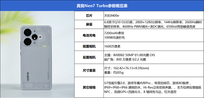 真我Neo7 Turbo内置联发科天玑9400e移动平台,这枚平台此前在一加Ace5竞速版中首发搭载。