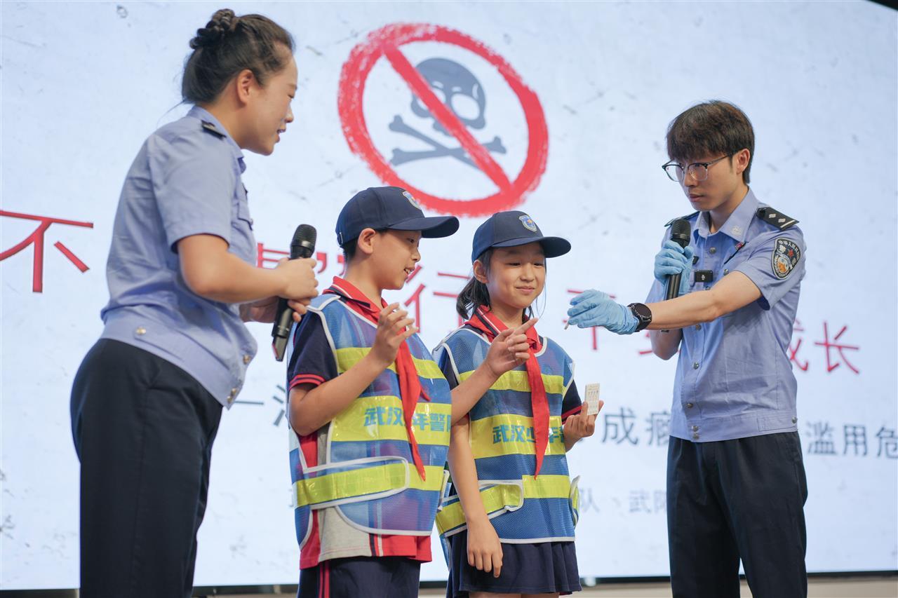 “珍爱生命,远离毒品!”6月23日,在第38个国际禁毒日前夕,武汉少年警队在武汉市汉阳区禁毒教育基地举行“青春不‘毒’行,平安伴成长”禁毒主题活动,20名来自汉阳区夏明翰小学的少年警队队员在禁毒民警的带领下,体验了一场沉浸式禁毒课堂。