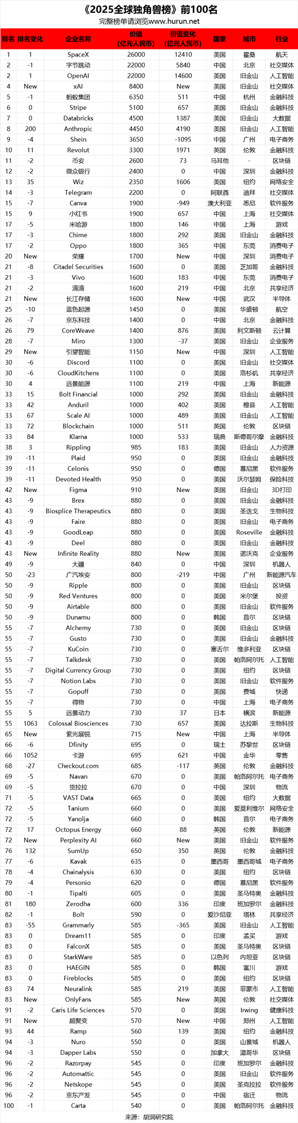 6月27日消息,胡润百富最新发布了《2025全球独角兽榜》,列出全球成立于2000年之后、价值10亿美元以上的非上市公司。
