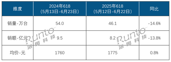 根据洛图科技数据显示,2025年618促销期间(5月12日-6月22日),智能投影在中国传统主流电商市场的销量为46.1万台,同比下滑14.6%;销额为8.2亿元,同比下降13.8%。