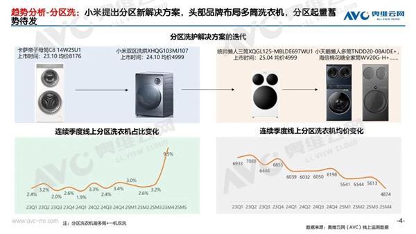 其中,双筒、三筒洗衣机正以惊人的速度成为消费者的新宠。数据显示,2025年3月以后多筒产品在线上渗透率快速攀升,占比从3.2%涨到5月的9.5%。