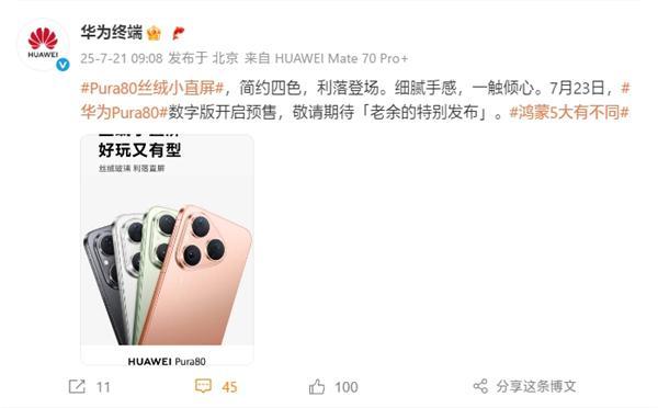 7月21日消息,华为终端官微宣布,华为Pura 80标准版将于7月23日正式开启预售。