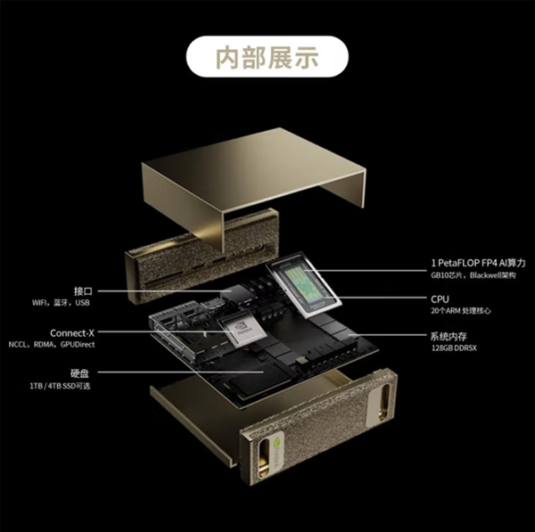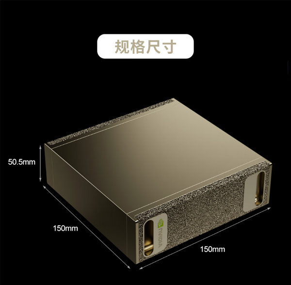 DGX Spark采用了金黄色的外观设计,尺寸为150mm长×150mm宽×50.5mm高,重量仅1.2千克,与普通家用小盒子电脑相似,便于携带和放置。
