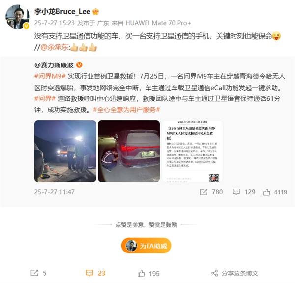问界M9首次卫星救援 华为李小龙:买台支持卫星通信的手机 关键时刻也能保命