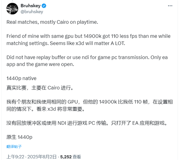 相比之下,根据Bruhskey的说法,他朋友使用的是英特尔目前顶尖的游戏处理器之一酷睿i9 14900K,但是在使用相同的显卡和图形设置,他朋友的FPS比其大约低了110,也就是约30-33%。