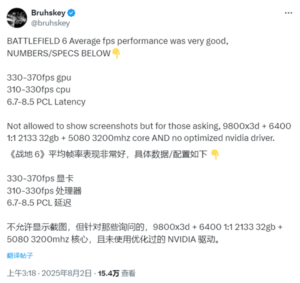 Bruhskey表示,他的具体配置包括9800X3D、32GB内存以及RTX 5080,在1440p原生分辨率下达到了330帧左右。