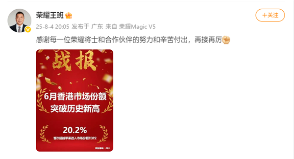 8月4日消息,据荣耀终端股份有限公司销售与服务总裁@荣耀王班 介绍,荣耀6月香港市场份额达20.2%,创造历史新高。