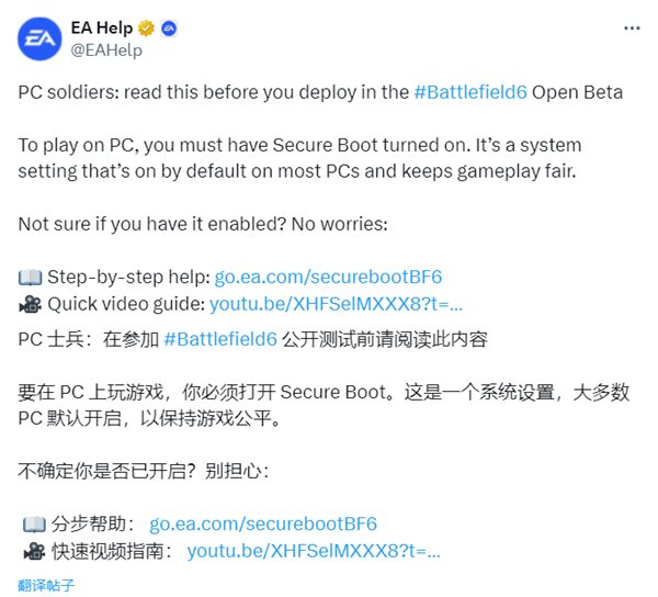 不过EA日前强调,Windows PC玩家必须启用一个安全功能才能体验这款游戏,EA支持团队指出,参与《战地6》公测的玩家需要在PC上启用安全启动(Secure Boot)。