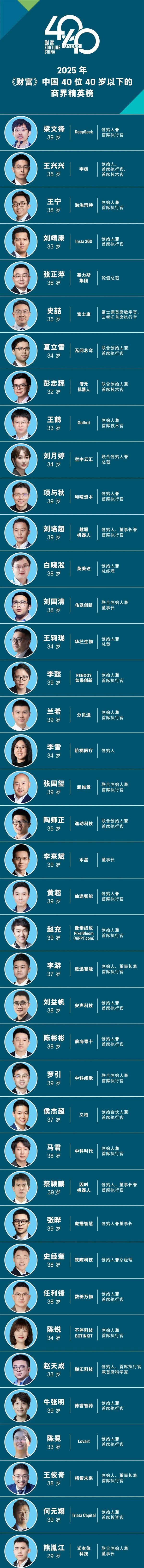 2025财富中国40位40岁以下商界精英榜发布:DeepSeek梁文锋排首位