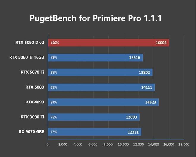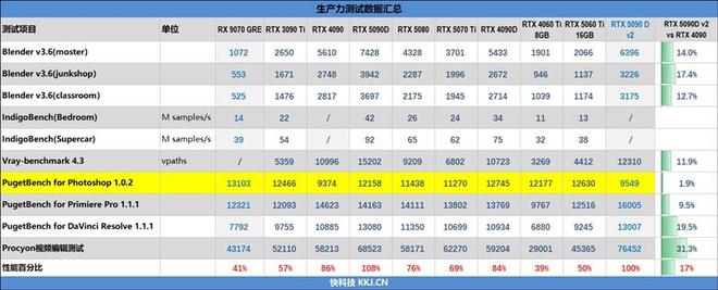 总体来说,RTX 5090 D v2的是生产力性能比起上代的RTX 4090有17%左右的提升,不过有部分软件测试出现异常,IndigoBench无法识别NV显卡,PugetBench for Photoshop跑分偏低,经过多次尝试,确认是驱动的原因。