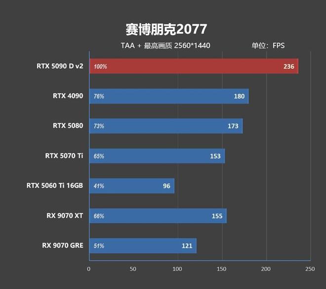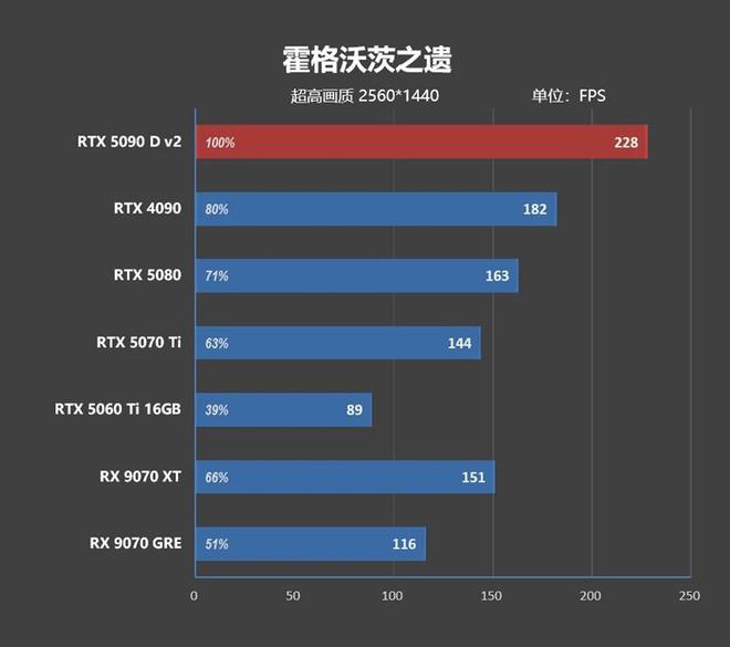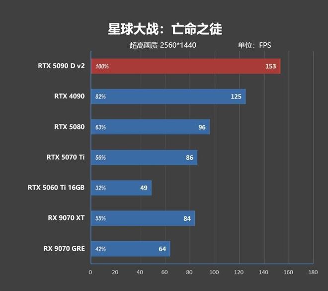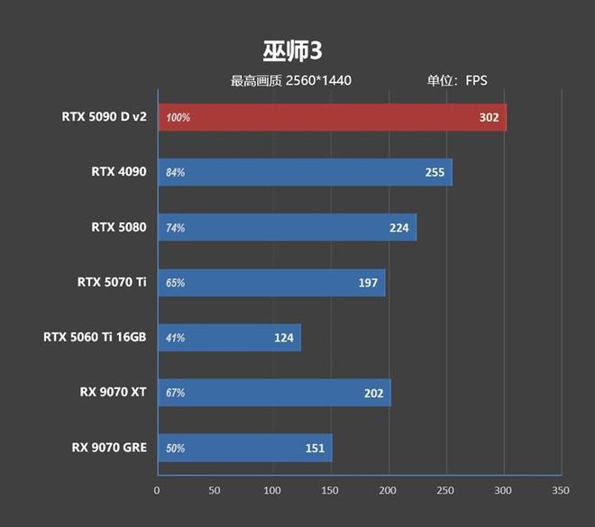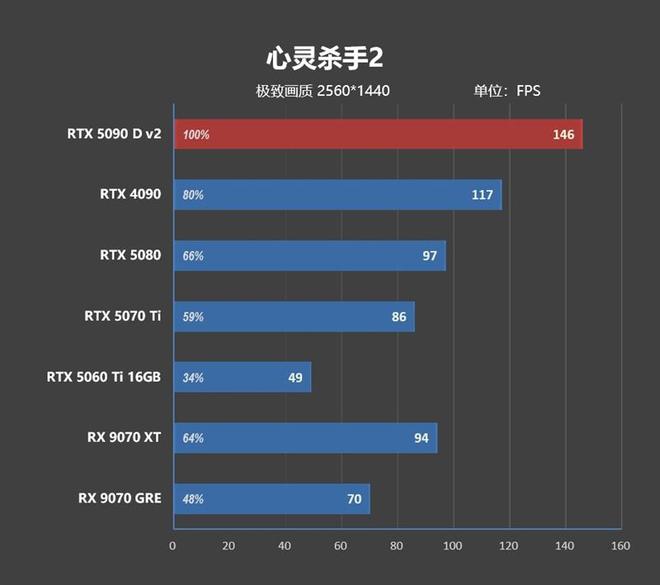 到了2K分辨率之后,情况好了一些,RTX 5090 D v2比RTX 4090要强了16.4%,比RTX 5080则强了33%。