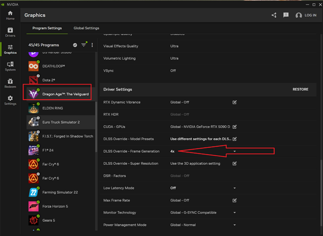 《龙腾世纪:影障守护者》需要在NVIDIA app里面开启DLSS 4多帧生成。