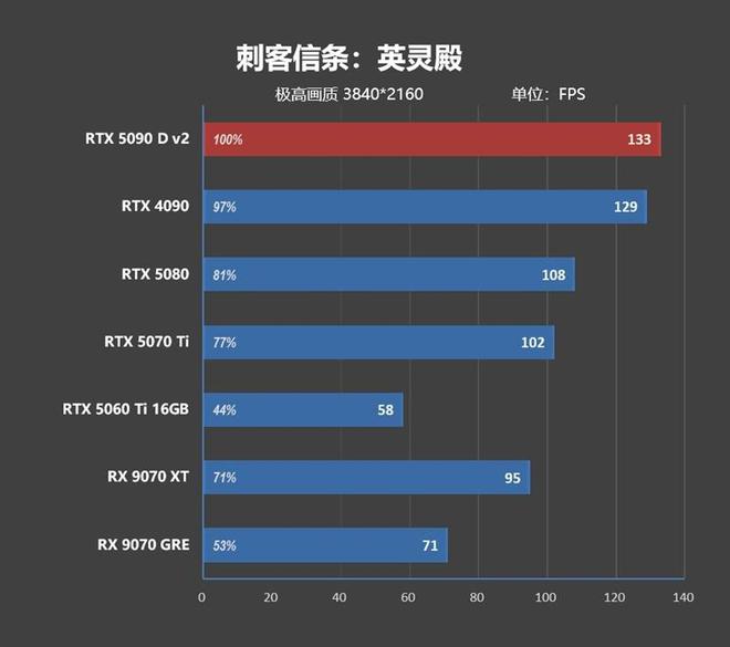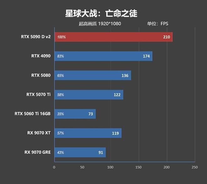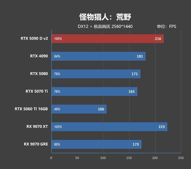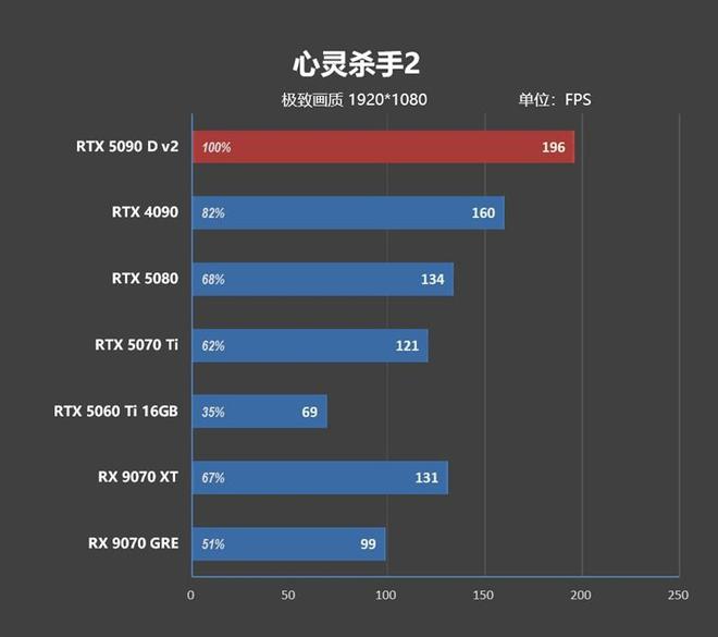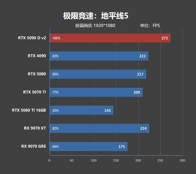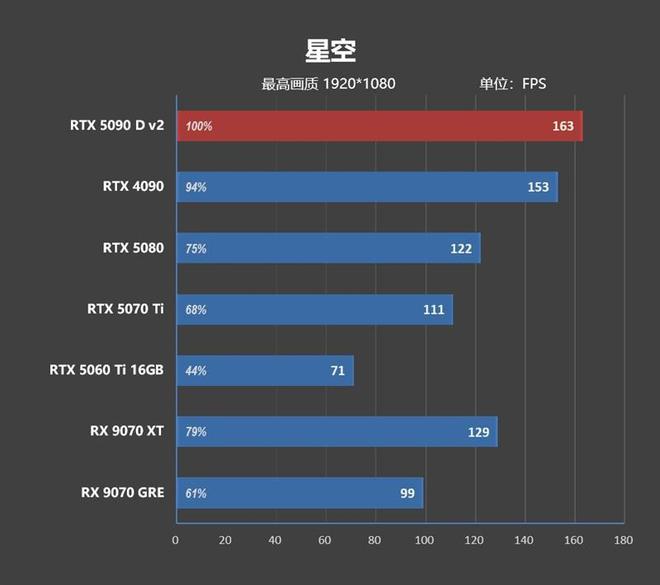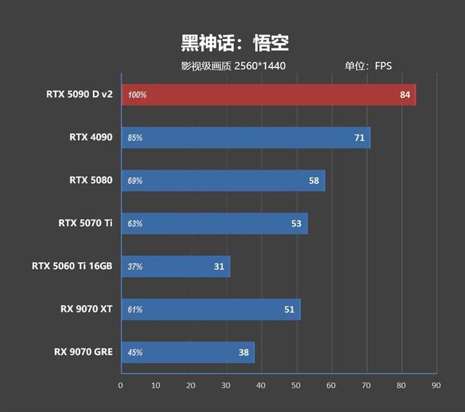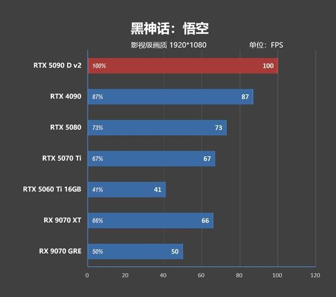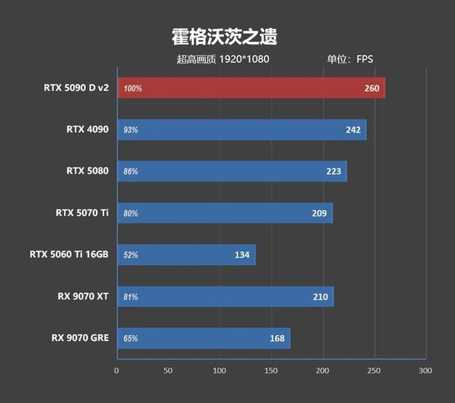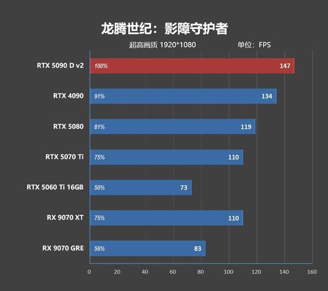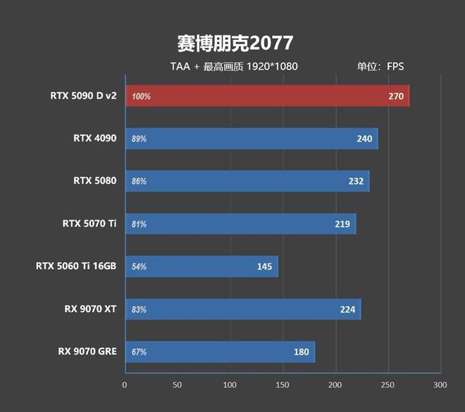 1080P分辨率下 ,由于CPU存在巨大的瓶颈,高端显卡之间完全无法拉开性能差距,RTX 5090 D v2只比RTX 4090快了8.8%,比RTX 5080快了21.7%。