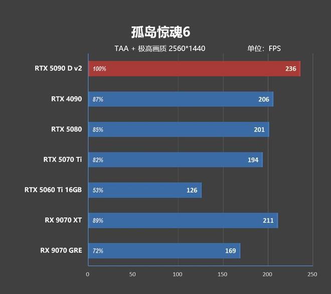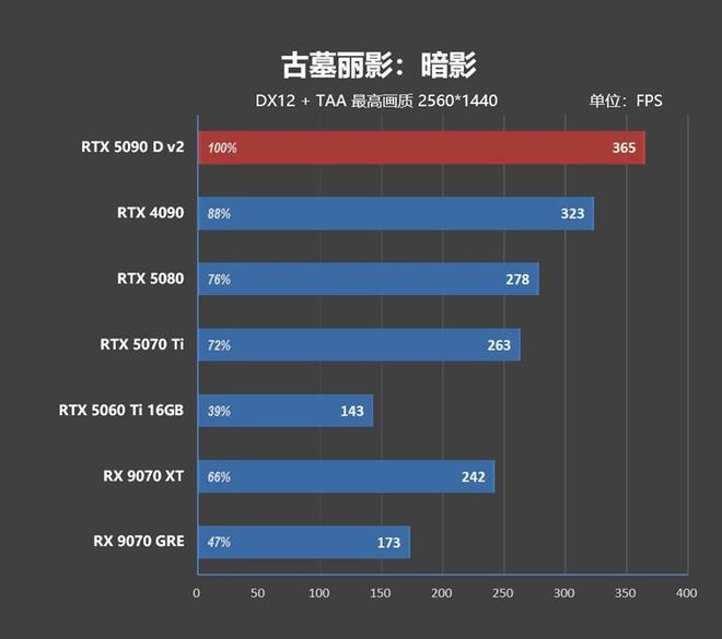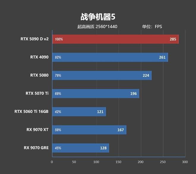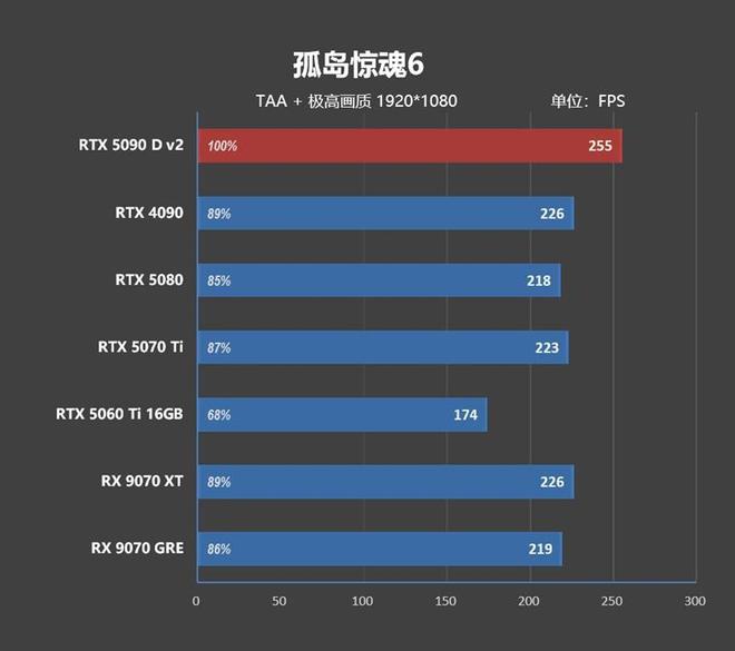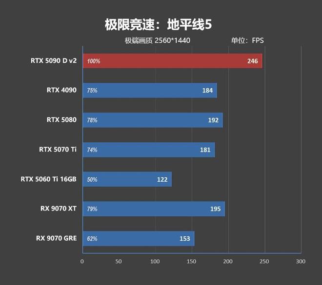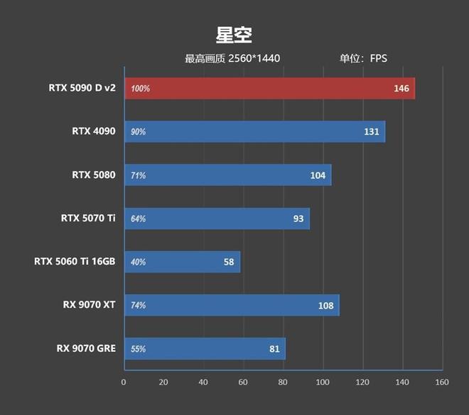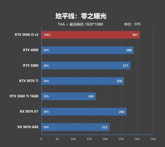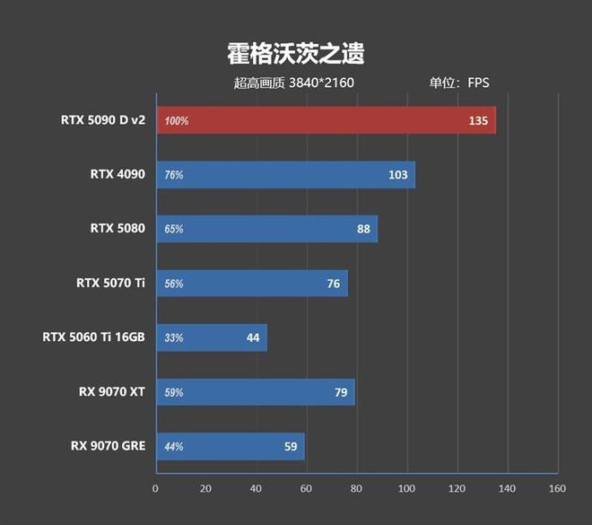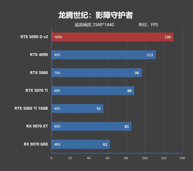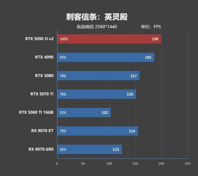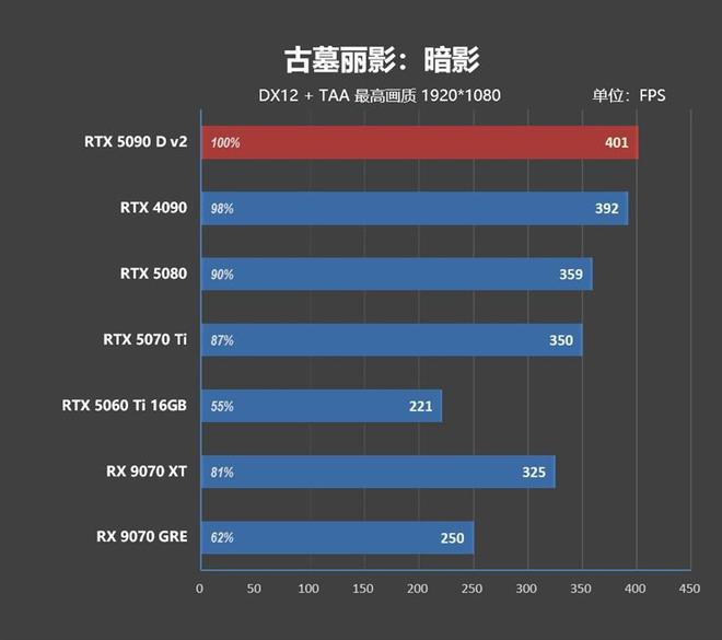 1080P分辨率下 ,由于CPU存在巨大的瓶颈,高端显卡之间完全无法拉开性能差距,RTX 5090 D v2只比RTX 4090快了8.8%,比RTX 5080快了21.7%。