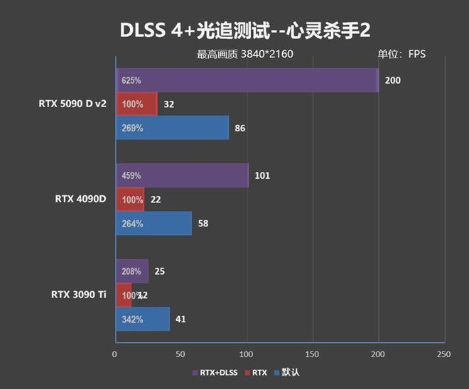 我们测试了6款游戏,在开启DLSS 2(不开插帧)时,RTX 5090 D v2的平均提升幅度为119%,RTX 4090D和RTX 3090 Ti则有134%左右。