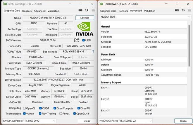 由于RTX 5090 D v2没有公版,此次首发测试我们使用的是七彩虹iGame GeForce RTX 5090 D v2 Vulcan OC 24GB。